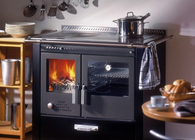 La cuisinière à bois moderne, souvent associée à une cuisinière électrique traditionnelle, peut assumer à la fois la fonction de cuisson et celle de chauffage. Les cuisinières à bois sont souvent équipées d’un échangeur de chaleur qui charge un accumulateur d’énergie. Elles sont souvent associées à un poêle à accumulation.
